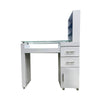 Modelo elegante con repisa alta y superficie de vidrio templado. Cuenta con múltiples cajones para mayor organización. Perfecta para estudios de uñas de alta rotación.